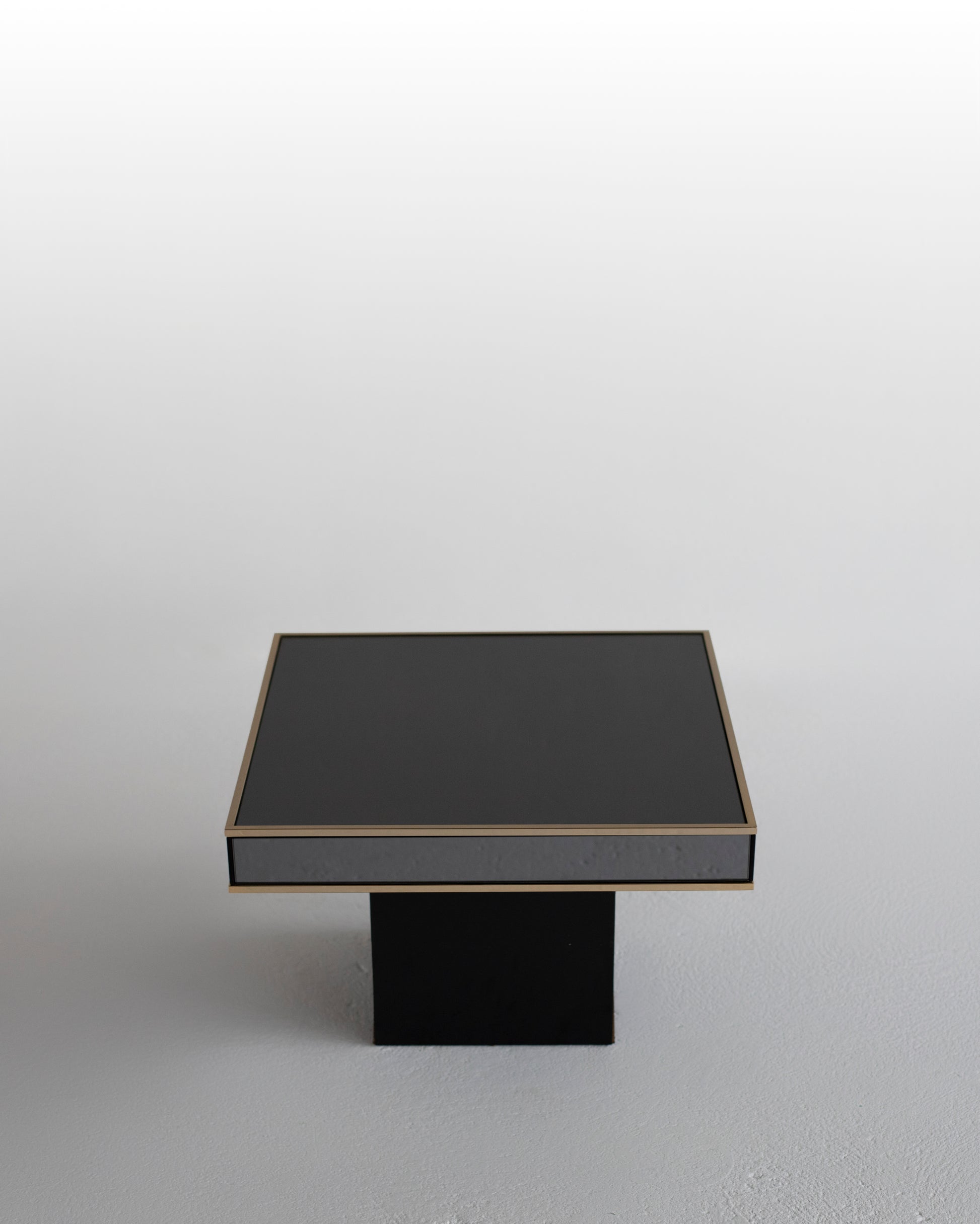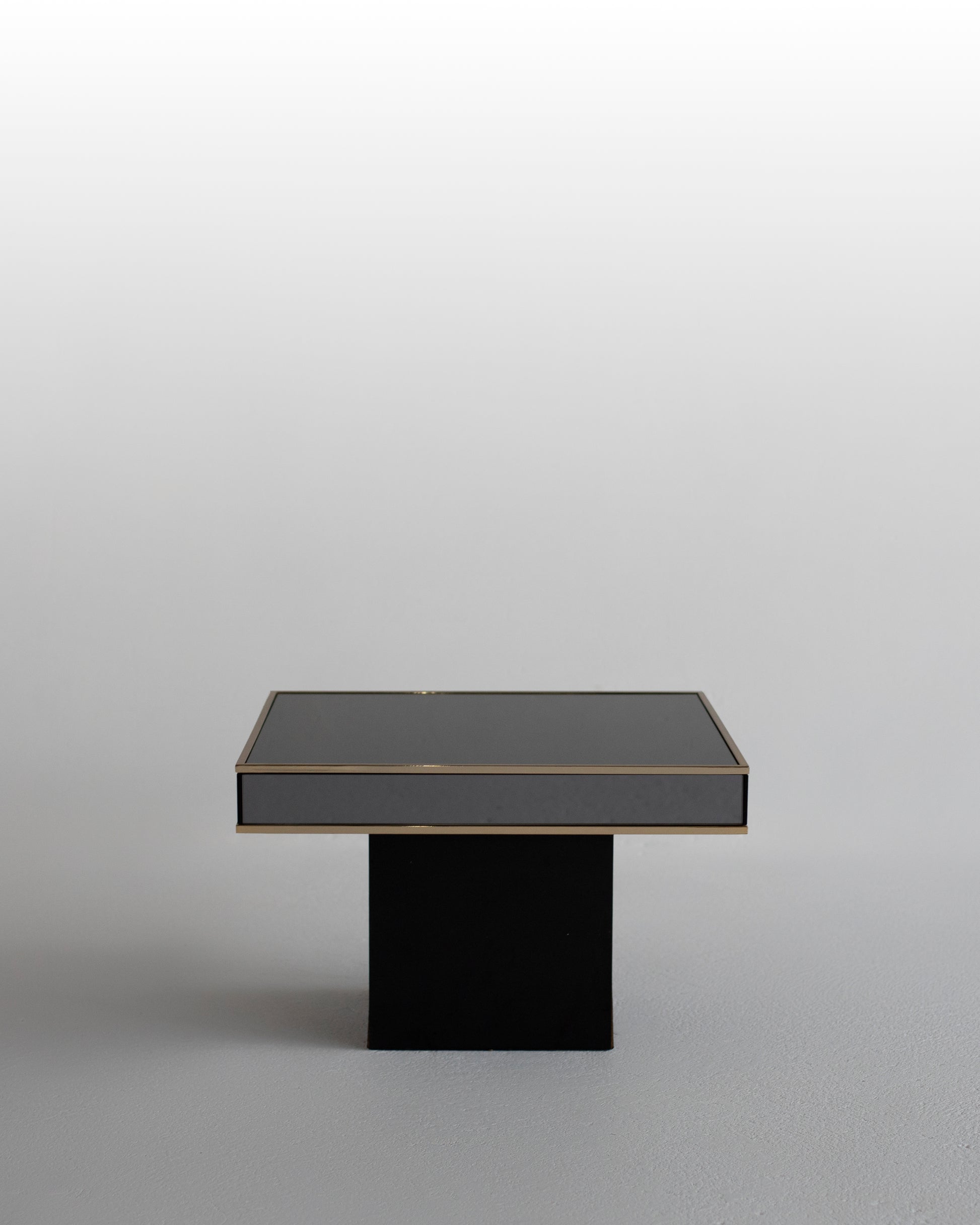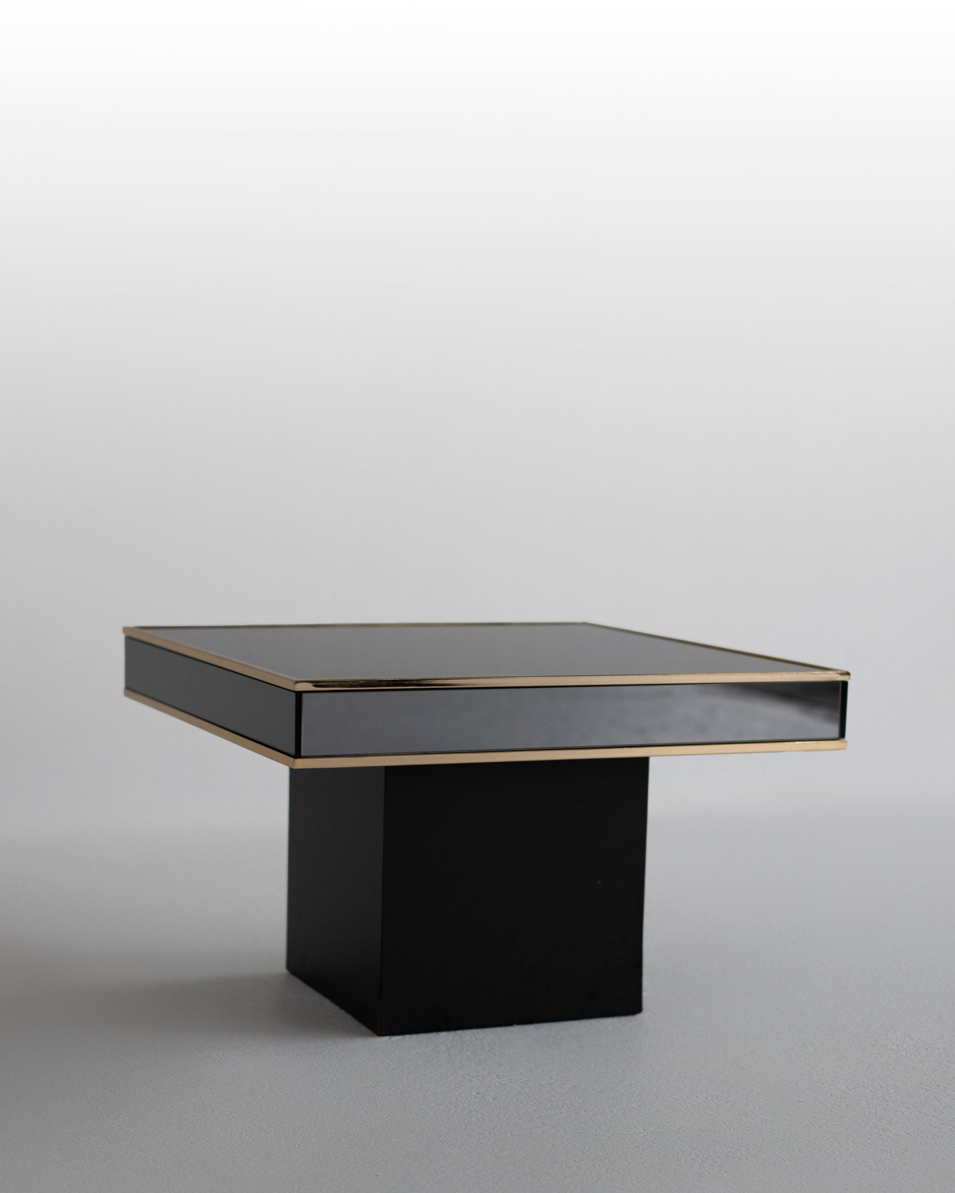 Le plateau et la ceinture sont habillés de miroirs gris, soulignés d’un encadrement en laiton, avec une base cubique en bois laqué noir qui affirme une présence graphique, sans lourdeur. Format idéal en table d’appoint (bout de canapé) ou petite table basse.