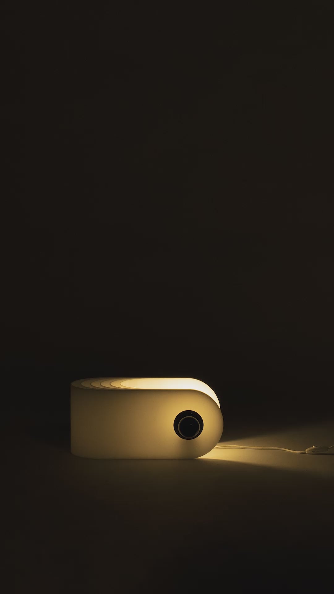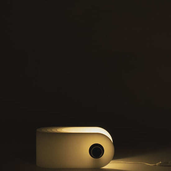 Lampe de table sculpturale réalisée en acrylique blanc, acier et nylon, composée de panneaux géométriques imbriqués formant une structure spiralée rappelant une coquille. Une sphère noire en façade relie et stabilise les éléments, agissant à la fois comme point d’articulation structurel et accent visuel.