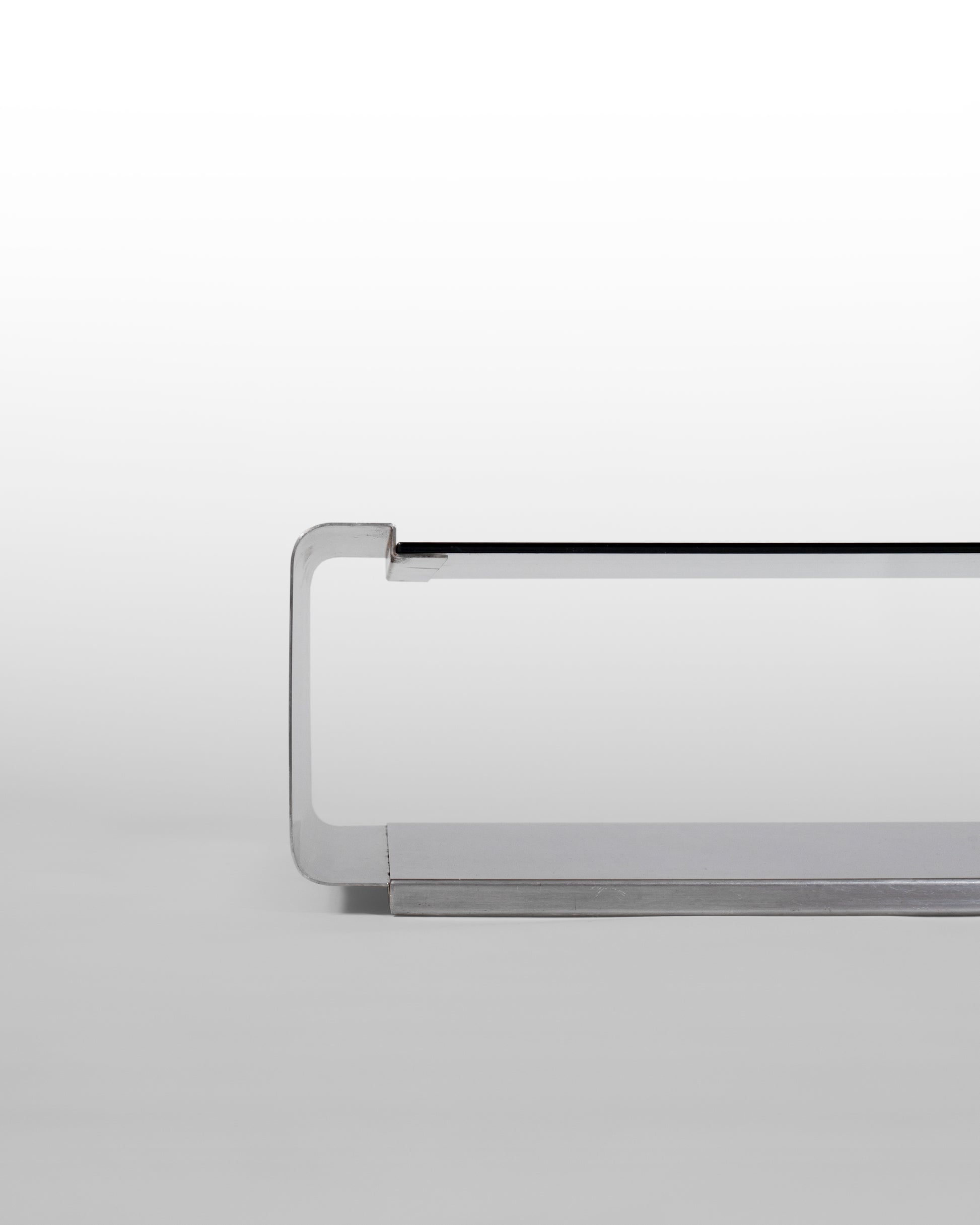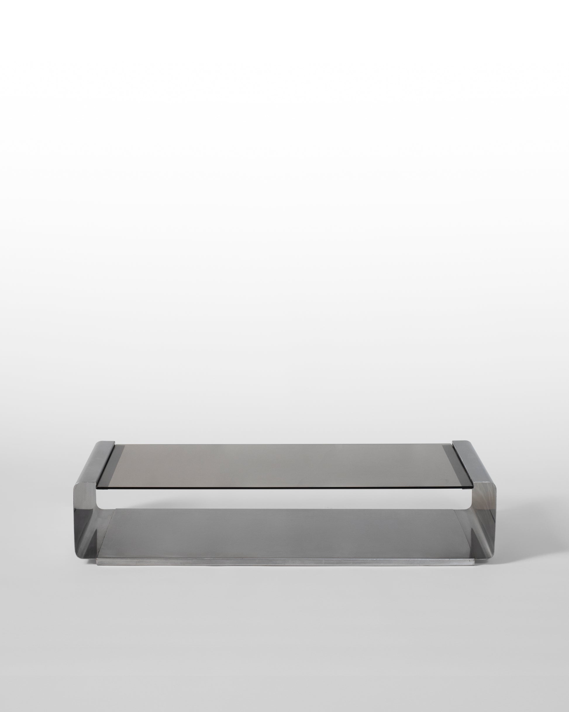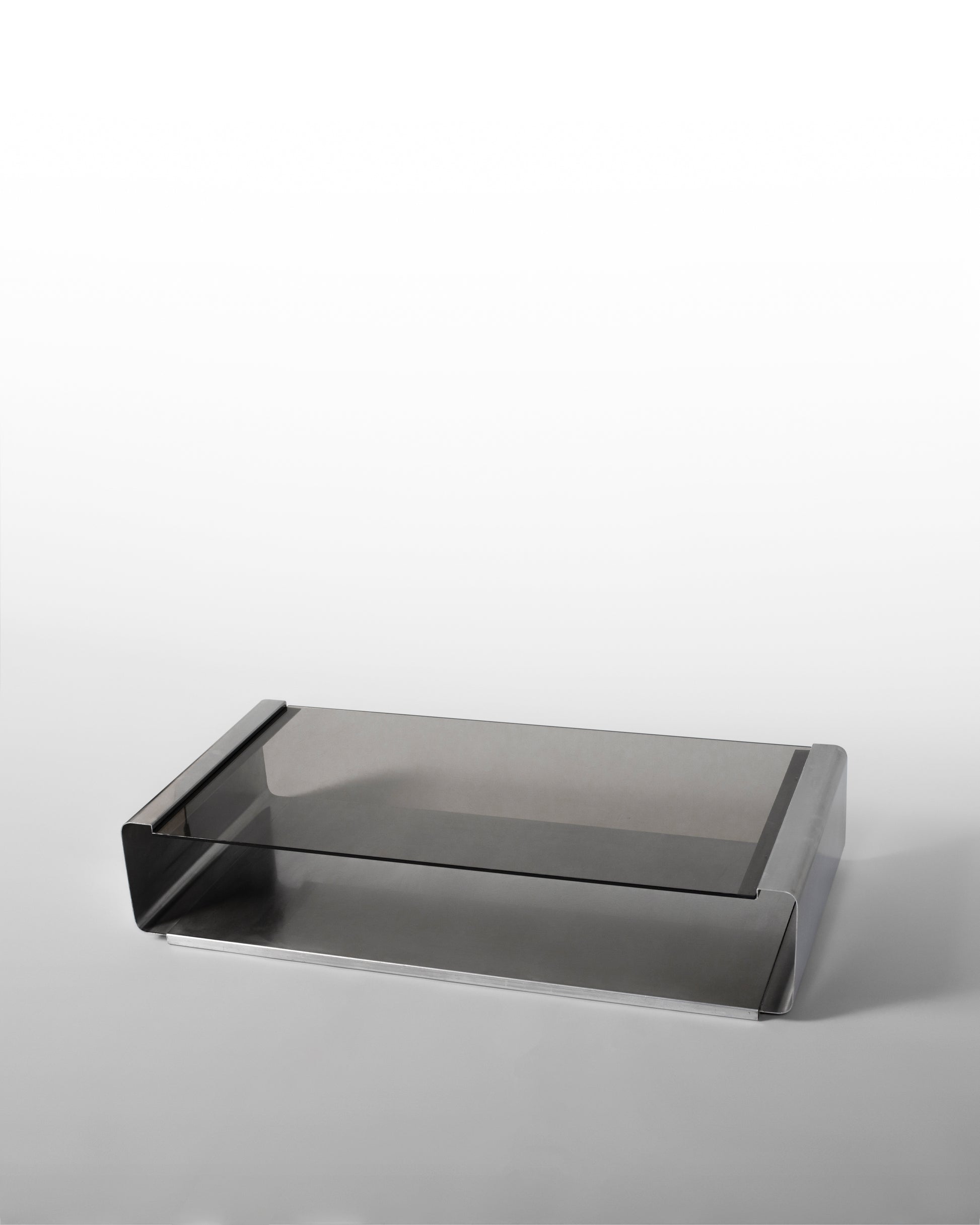Table basse rectangulaire composée d’un unique cadre en acier inoxydable brossé, thermoformé en une seule pièce, supportant un plateau en verre trempé teinté. Le design, réduit à sa géométrie essentielle, illustre la rigueur minimaliste et le raffinement matériel caractéristiques de la production italienne des années 1970.