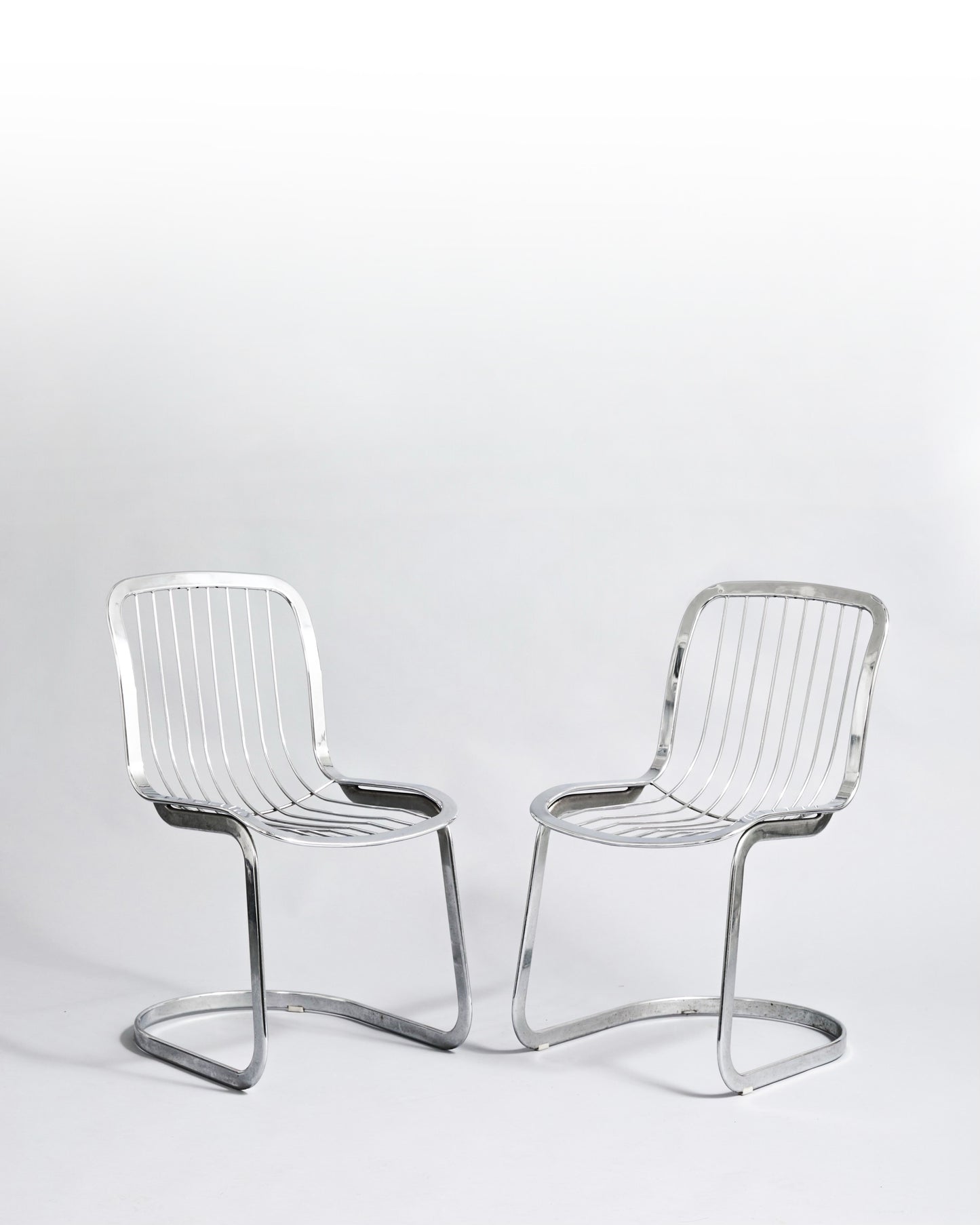 Paire de chaises cantilever par Willy Rizzo pour Cidue, réalisées en métal chromé et incarnant tout le glamour du style Hollywood Regency des années 1970. Leur structure fluide et équilibrée joue avec les reflets, apportant une touche lumineuse et architecturale à tout espace.