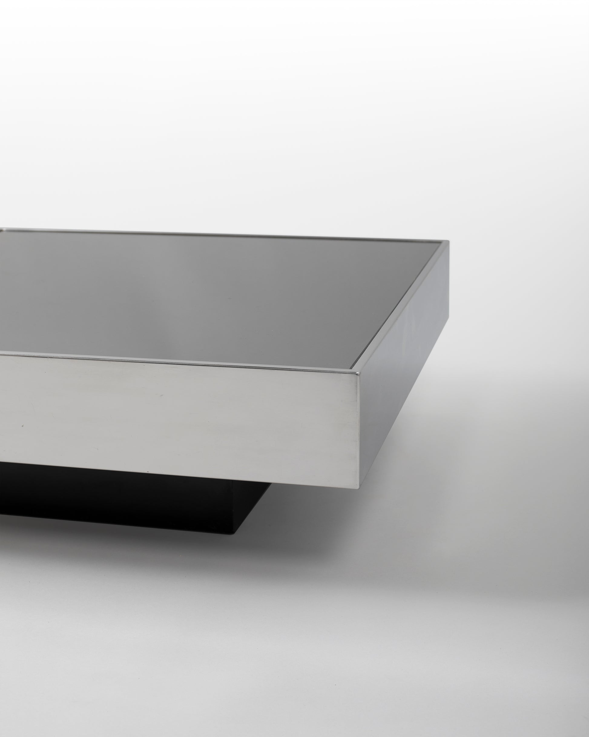 Table basse carrée, designé par Willy Rizzo pour Cidue, années 1970 Conçue par Willy Rizzo pour l’éditeur italien Cidue, cette table basse carrée incarne l’essence du luxe minimal des années 70. Le piètement en chrome poli, d’une précision presque joaillière, soutient un plateau en verre fumé à la teinte profonde et nuancée, révélant un subtil jeu de lumière et de matière. Par ses proportions équilibrées (80 x 80 cm) et son écriture géométrique affirmée, cette pièce déploie une élégance discrète, entre rigueur moderniste et séduction visuelle. Son dessin pur, tout en maîtrise, évoque les codes du Hollywood Regency tout en s’inscrivant dans une recherche d’épure typique de l’esthétique Space Age.